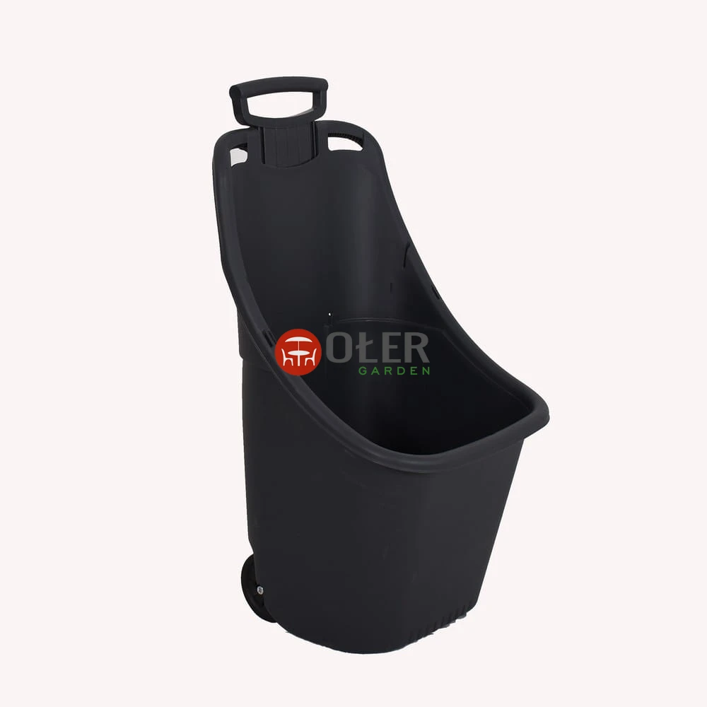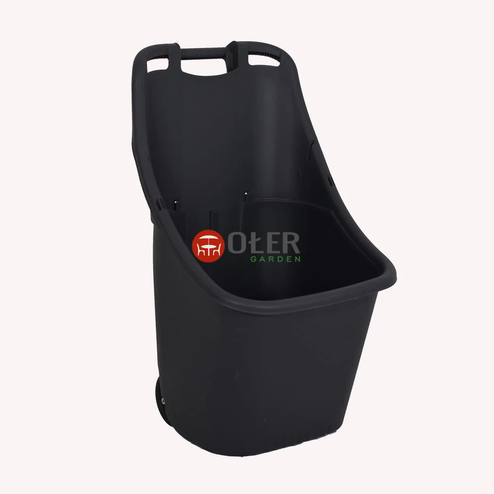 Odcień grafitu to praktyczny wybór: wizualnie jest stonowany i neutralny, a w codziennym użytkowaniu mniej widać typowe ślady pracy w ogrodzie. Powierzchnia tworzywa ma charakter stricte użytkowy – matowo-satynowy, z delikatną fakturą, która nie udaje „dekoracji”, tylko ma wytrzymać kontakt z ziemią, liśćmi oraz narzędziami. Kolor szaro-grafitowy dobrze komponuje się z tarasami, schowkami, altanami i ogrodzeniami, gdzie często pojawiają się stal, antracyt i drewno. Całość prezentuje się jak solidny pojemnik roboczy, a nie sezonowy dodatek, który po kilku tygodniach trafia w kąt.